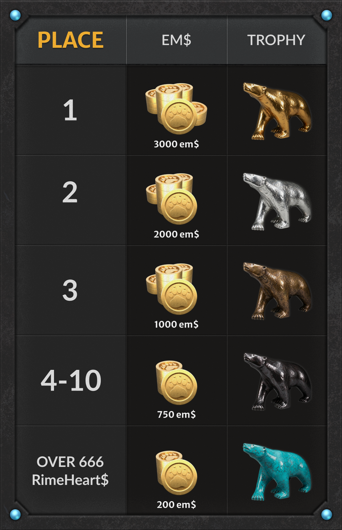 Participate for the prizes, the trophies, and the glory! The hunter with the most RimeHeart$ at the end of February 10th will win Community Prizes!